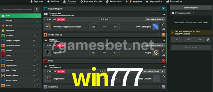 O win777 oferece uma grande seleção de opções de apostas em e-sports com probabilidades competitivas